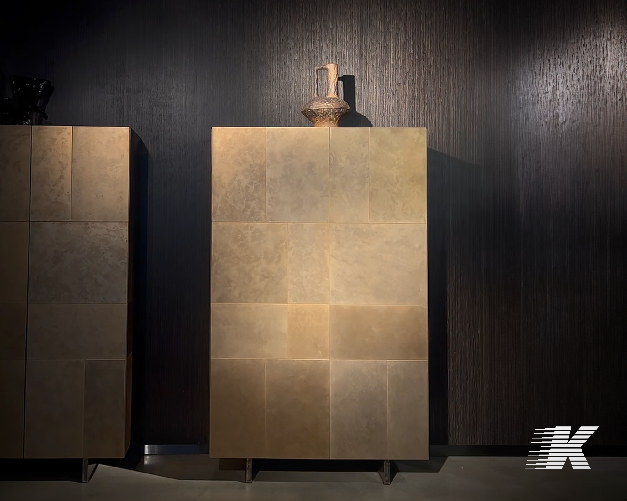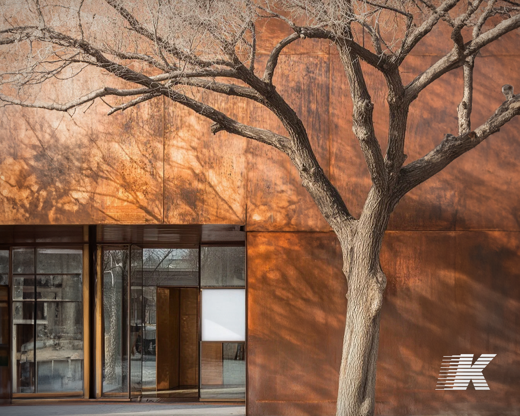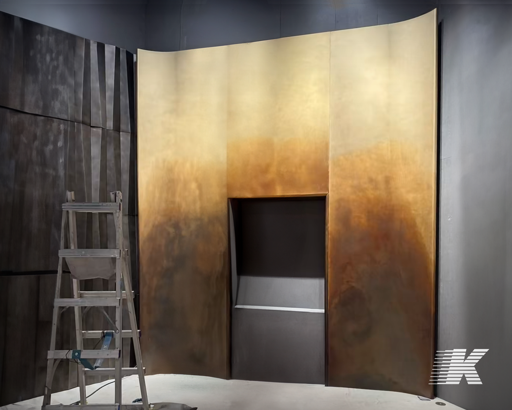 What are the benefits of using aged metal panels for interior cladding?